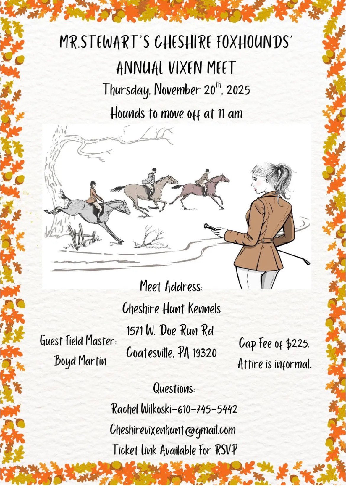 Join us for one of the most exciting meets in the North East, a day designed especially for all the lady foxhunters! Join a field led by Olympian Boyd Martin and ride alongside women from across the North East!