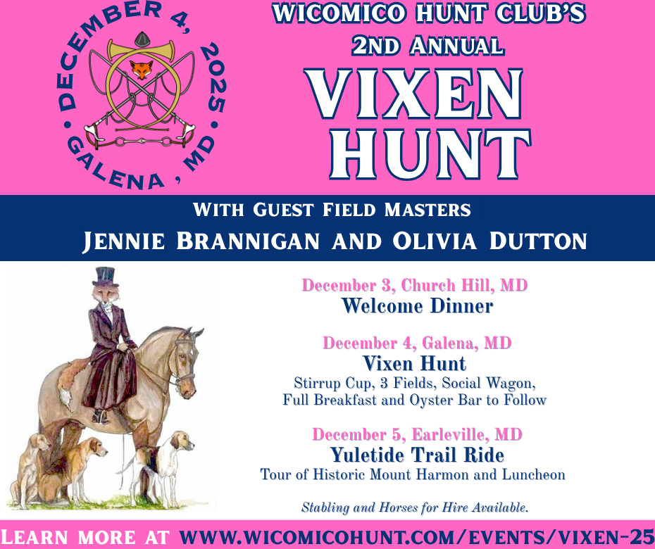Join us for a weekend designed especially for all the lady foxhunters! Ride alongside the WHC's 2 incredible field masters on the gorgeous waterfront of the eastern shore of Maryland. There will be 4 fields, giving many options for riders to join.